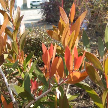 レッドロビン(バラ科) ツヤツヤとした鮮紅色の若葉が美しい園芸種です。日本原産のカナメモチと中国原産のオオカナメモチがニュージーランドで交配され育成されました。日本種のベニカナメモチと区別してセイヨウベニカナメモチとも呼ばれます。まだ柔らかくて葉緑素も十分に形成されていない若葉を「アントシアニン」の赤い色素で紫外線から守っているとも言われています。 |