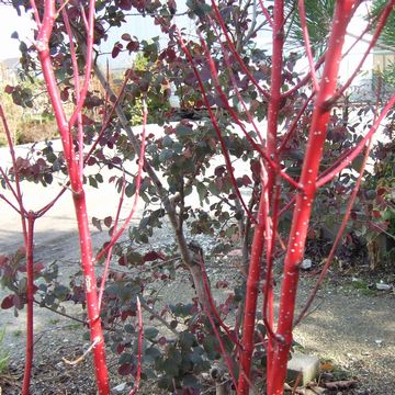 サンゴミズキ (ミズキ科) 日本・シベリア原産の落葉低木です。ベニミズキ、サンゴモミジ とも呼ばれます。冬に枝が美しい赤(サンゴ色)に色付くので、この名がつきました。シラタマミズキの変種で、5~6月頃5mm程度の黄白色の小花を多数つけます。果実は楕円形で秋に白く熟します。撓める事ができるので花材にも使われます。 |