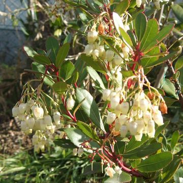 イチゴノキ(ツツジ科) ヨーロッパ南東部原産の常緑性の低木です。花茎が垂れ下がり、壺を逆さにしたような形のドウダンツツジに似た小さな白い花をたくさん付けます。花が咲く頃に前年の花の果実が色付きます。花と果実が同時に楽しめる訳です。赤く熟した果実の表面がイチゴを連想させるところから、「イチゴノキ」「ストロベリーツリー」ともよばれますが、果実はむしろヤマモモに似ています。
