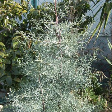 コニファー ブルーアイス(ヒノキ科) 北米原産。銀白色の葉色や円錐形の樹形が美しく、丈夫なため人気があります。アリゾナイトスギの系統に属し、コニファーの中でも木の香りが特に強い品種です。新芽を出す力が強く、成長が早いため刈り込みに耐えます。本来、雨や風の少ない場所に自生しているため多湿には弱いです。リースにしても綺麗です。