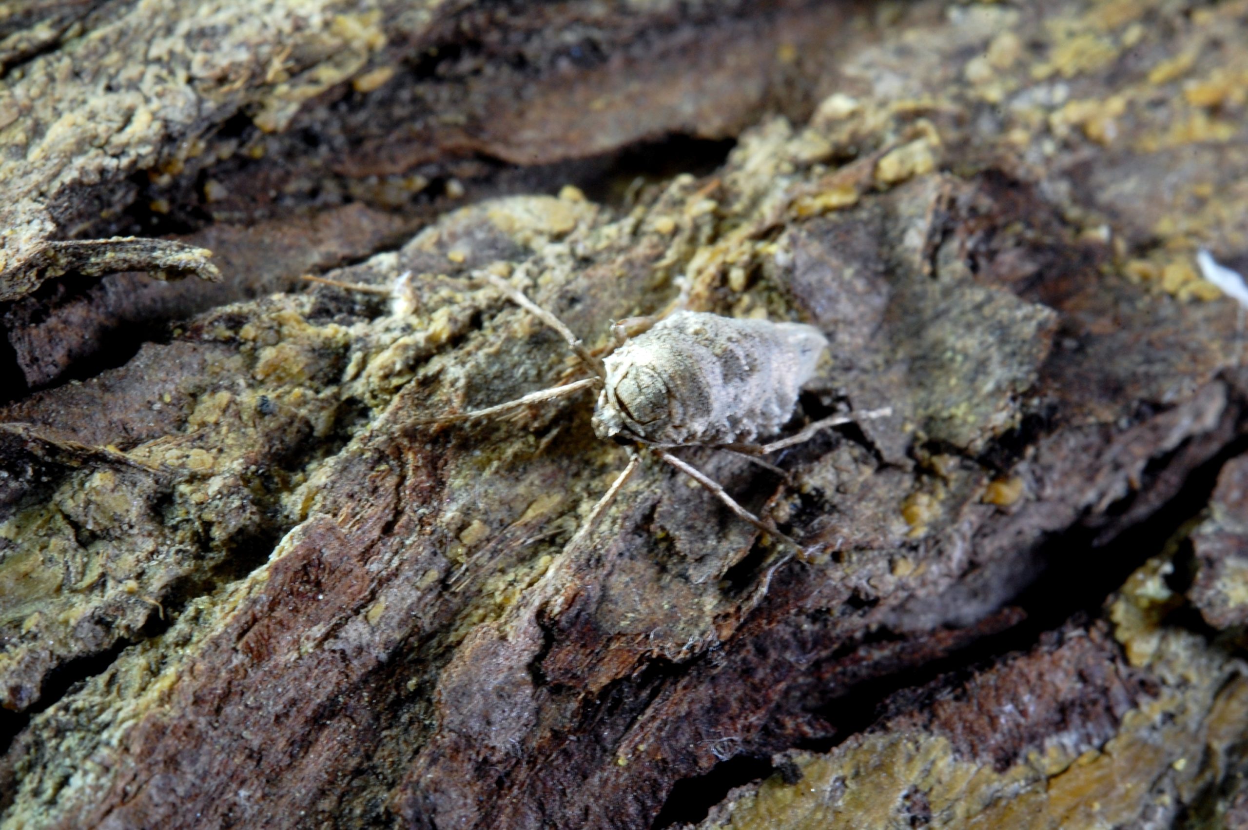 桜の開花までまだ日にちのある3月初め、大阪府北部にある神社のクロガネモチの幹に見慣れないクモのような昆虫を見つけました。フユシャクのメス成虫です。フユシャクは晩秋から早春にかけて成虫が活動するシャクガ科の蛾の総称で、国内には約35種が知られています。オス成虫にはちゃんと翅があり飛び回りますが、メス成虫には翅が全くないか退化していて飛べません。写真にありますように体長約5mm、翅がなく、脚は長く動きも素早いため一見クモと間違いそうです。夜行性で、羽化したメスは杭の上などに移動し、オスを呼ぶためのフェロモンを出します。このフェロモンでオスが呼び寄せられ交尾します。交尾後コナラ、クヌギ、サクラなど幼虫の餌になる木に産卵し死亡します。孵化した幼虫は木の葉を食べ夏までに地上へ降り蛹化し寒い冬まで眠ることになります。