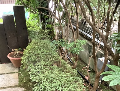 | 施工内容 | 2カ所の水源(立水栓)に取りつけた潅水コンピューター(雨センサー含)から各植栽に潅水ホース(孔間隔30cmと50㎝)を通じて自動で水を出るようにし、ガレージ上だけは覆土の浅い植栽で水はけがよくないので、孔間隔50cmの潅水ホースを敷設した。なまた塀の前の花壇にが給水パイプから接続した潅水ホースを、鉢に5mmチューブの先についているオクタフローを根元に差し込み、無人化による自動潅水を可能にした。 |