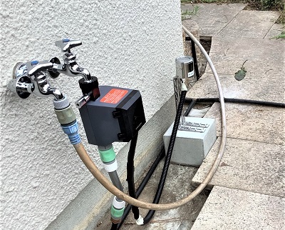 | 家のまわりの植栽(高中低木・地被類)並びに塀の前にある花壇及び鉢に対して、2つのブロックに分けて、2カ所の水源(立水栓)に潅水コンピューターを設置。それぞれの潅水コンピューターより給水パイプを経由して、各植栽に潅水ホースを敷設し水圧が下がらないよう時間差をつけて自動で水が出るようにした。 |