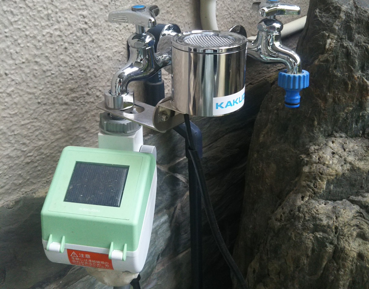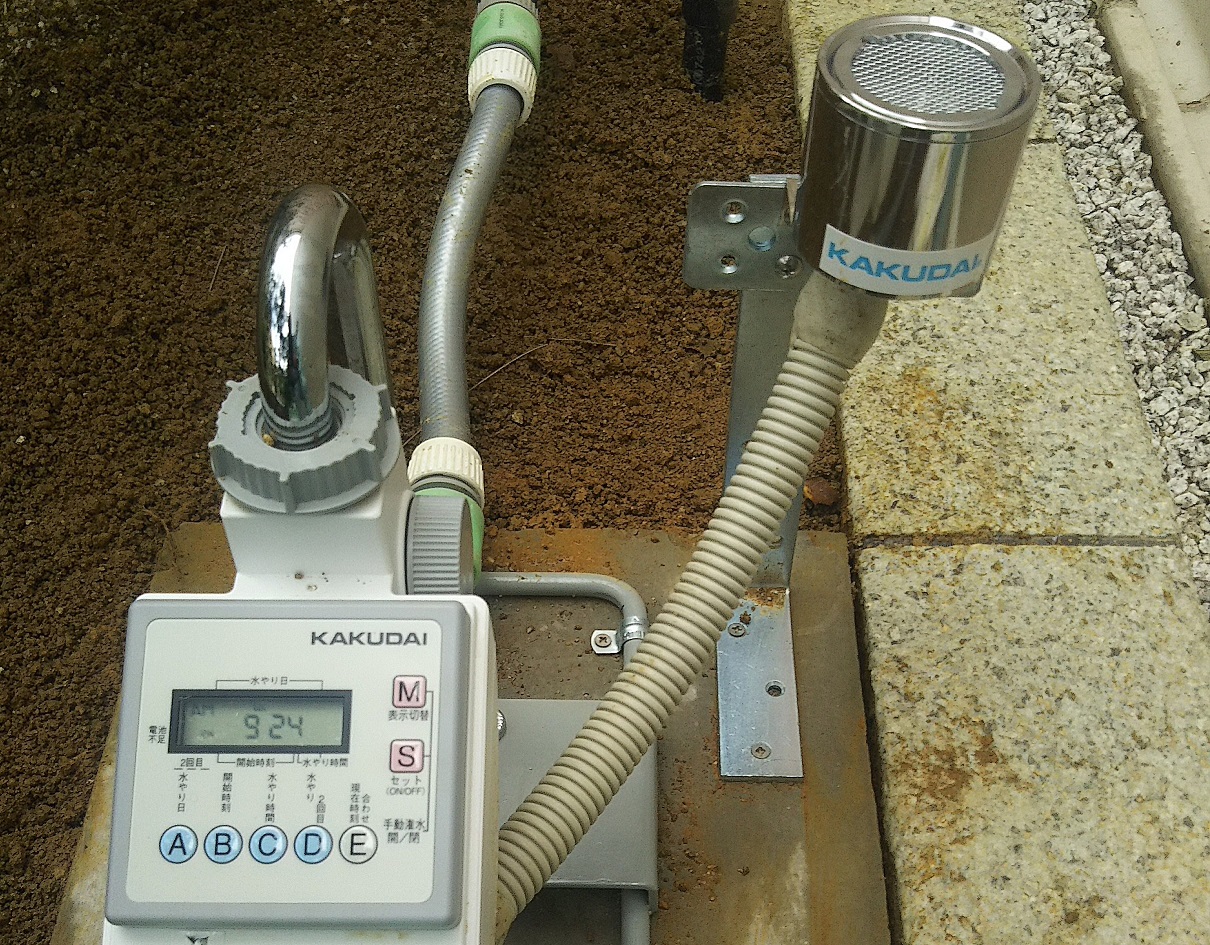 | 施工内容 | 省エネタイプのソーラー発電式潅水コンピューターは、水源取出し口(散水栓用及び立水栓用)に応じたものを雨センサーと共に取付け、植栽の根元に布設する点滴式潅水ホースも見た目も意識して埋設するなど施工にも配慮した。各庭の植栽に応じた潅水プログラムで最適な管理ができるようにした。 |