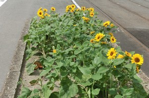 実は今回、花壇端のヒマワリは、交通の見通しが悪くなるので、花が咲く前に