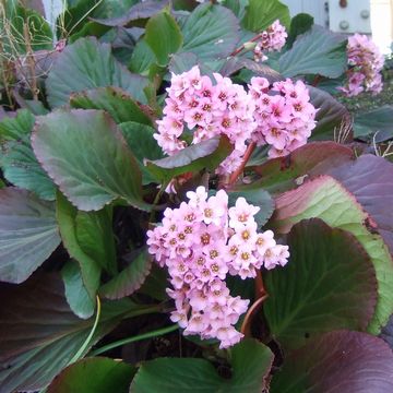 ヒマラヤユキノシタ(ユキノシタ科) ヒマラヤ山脈に分布する多年草です。地面を横に這うように伸びる太い根茎から、うちわのような光沢のある大きな葉を出します。春になると花茎を長く伸ばしその先に淡いピンクや白の花が集まって開花します。生長はゆっくりですが、耐寒性が強く手間もかからないのでグランドカバーにも利用されます。本来、ヒマラヤユキノシタはベルゲニア・ストレイチーにつけられた和名ですがその交雑種もこの名前で出回ることが多いです。 |