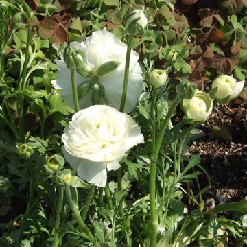 ラナンキュラス (キンポウゲ科) ラナンキュラスとは本来はキンポウゲ属の総称ですが、園芸界でこの名で市販されるのは、ヨーロッパ~西南アジア原産のハナキンポウゲR. asiaticus L.から改良された品種です。春に薄い花びらが幾重にも重なった華麗な花を開きます。名前はラテン語でカエルを意味する「ラナ」に由来します。ラナンキュラスの仲間の多くがカエルが住むような湿地に自生することにちなみます。花言葉は「晴れやかな魅力」「美しい人格」