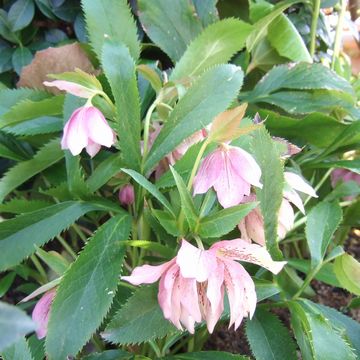 クリスマスローズ(キンポウゲ科) ヨーロッパ~西アジア原産です。クリスマスに咲くのはへボラス属の「二ゲル」ですが、早春に咲く「レンテン・ローズ」もクリスマスローズと呼ばれます。花びらに見えるのは萼で、花びらは退化して小さな蜜腺となり、おしべの付け根を囲むような形で小さく残っています。写真はダブル(八重咲き)の品種で、抑えた花色とボリュームのある花姿がエレガントです。花言葉は「中傷」「誹謗」「中毒」「悪評」「発狂」など毒々しいです。有毒です。 |