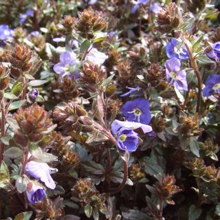 ベロニカ・オックスフォード(ゴマノハグサ科) ヨーロッパ原産の宿根草です。キリスト教伝説に語られる聖女ベロニカにちなんでこの名がつきました。花を穂状につけるスピカータと違ってオックスフォードは写真のように小さな一重の花を付けます。細やかな葉、茎がクッション状にやわらかく茂り、広がるように生育します。花は濃い青紫に白目が入りびっしりと咲き揃います。葉色はブロンズ色を帯び、秋冬はさらに深い色に紅葉します。性質が強健で、植えっぱなしでも増えるのでグランドカバーにおすすめです。