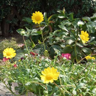 クリサンセマム・ムルチコーレ(キク科) アルジェリア原産の一年草。ムルチコーレ(たくさん分枝する)の名の通り、根元からよく分枝して匍匐して広がります。冬にはタンポポのようにロゼット状になります。春~初夏にひょろりと花茎を伸ばしてツヤツヤとした黄色い花を咲かせます。花びらは一重で丸く可愛らしく、色の鮮やかさも人目を惹きます。コリオステフス属に変りましたが、園芸の世界ではクリサンセマム・ムルチコーレで流通しています。花言葉は「高潔」「誠実」