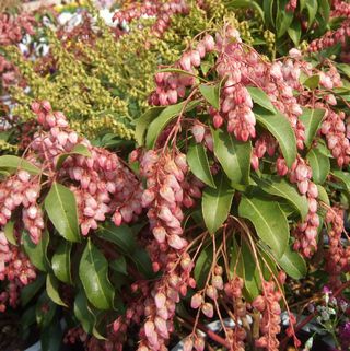 アセビ(ツツジ科) 昔から日本で親しまれてきた常緑低木で、2月か3月ごろから、枝先から花茎を伸ばして小さな壷型の花をたくさん咲かせます。一般の馬酔木は花色は白がポピュラーですが、写真は「クリスマスチェアー」と呼ばれる紅花馬酔木です。葉は濃緑で鈍くツヤがあります。日向でも育ちますが、日陰のほうが花色や葉色が美しくなります。漢字で馬酔木とあてるように有毒植物として知られています。万葉人はこの花を非常に愛したそうです。 ~わが背子に わが恋ふらくは 奥山の 馬酔木の花の 今盛りなり~万葉集 |