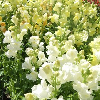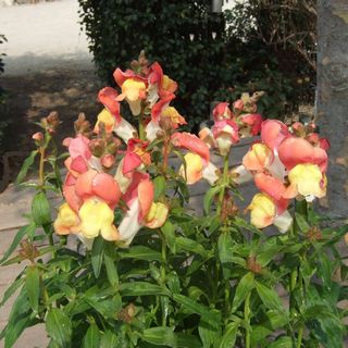 キンギョソウ(ゴマノハグサ科) 地中海沿岸に分布し、本来は多年草ですが園芸では一年草として扱います。多くの園芸品種があり、花色や姿もバラエティーに富んでいます。花茎をまっすぐ上に伸ばし、穂状にたくさんの花を咲かせます。主な開花期は春~初夏ですが、品種を選べば真冬に花を咲かせる事もできます。草丈は矮性種で20cm~30cm、高性種では1mに達するものもあります。花色は白、黄、ピンク、オレンジ、紅、緋色、紫などがあります。花言葉は「清純な心」「快活」と共に「推測ではやはりNOです」と不思議なものもあります。 |