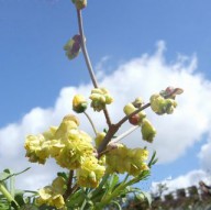 トサミズキ(マンサク科) 四国に分布する落葉性の低木~小高木です。高知(土佐)の蛇紋岩地に野生のものが多く見られるため、この名前があります。葉の形がミズキ科の樹木と似ているのでミズキと名前が付きますが、ミズキ科ではなくマンサク科です。早春から明るい黄色の花を咲かせ、江戸時代から庭木や盆栽、切り花として親しまれてきました。葉はタマゴ型で、裏は粉をふったように白っぽくなります。3月~4月にぶら下がるように花穂が長く伸び黄色い花を咲かせます。海外へは19世紀、シーボルトにより紹介されました。 |
