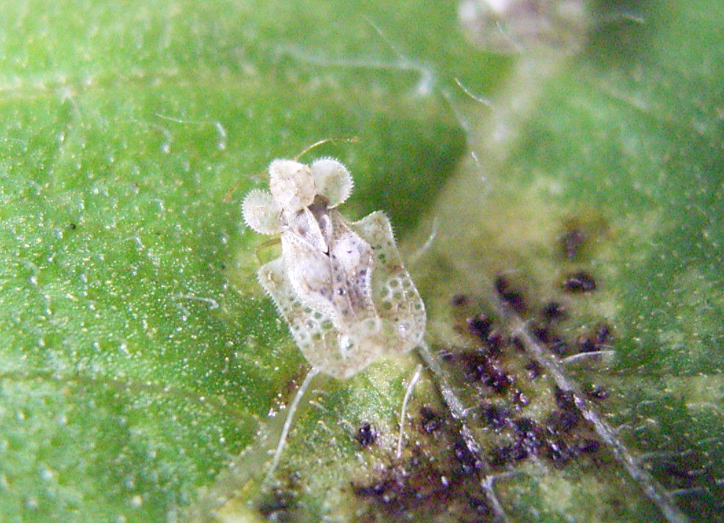 つつじの花が満開になるころ、葉の表面がかすり状に変色することがあります。その様な葉の裏を見ると、写真のような、相撲の行司が持つ軍配の形をした小さな虫が見られます。これも昆虫で、その名もグンバイムシと呼ばれます。カメムシの仲間でツツジに寄生するツツジグンバイムシ、菊の仲間に寄生するキクグンバイムシなどがいます。この写真はヒマワリの苗に寄生していたものでキクグンバイムシと思っていましたが、前翅周縁部に特徴的な棘が列生していることや前翅の模様からアワダチソウグンバイムシのようです。