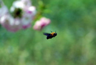 この蜂はクマバチ(属名で他のクマバチを指すこともあるため最近はキムネクマバチと呼び区別しています。)といいますが、いたっておとなしい蜂でむやみに手を出さなければ刺されることもありません。特にこの時期、飛び回っているのはオスですから刺しません。蜂で刺すのはメスだけです。オスは縄張りの巡回をし、自分のテリトリーに入ってきたものには、仲間はもちろん、蝶や鳥までも追いかけていきます。