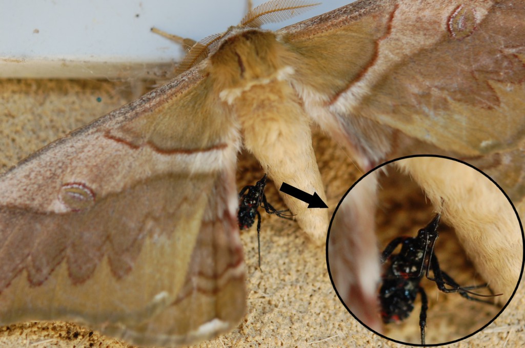 ところで、この写真の左下、クスサンの左わき腹あたりに黒いものが見られます。拡大してみますと、なんとヨコヅナサシガメ(肉食)の幼虫がクスサンの太い腹に口を刺し込み体液を吸収しているではありませんか。太っ腹のクスサンにとって、ちいさなヨコヅナサシガメが少々体液を吸っても応えないのか黙って吸わせていましたが、やがてサシガメを振り切って飛び去りました。