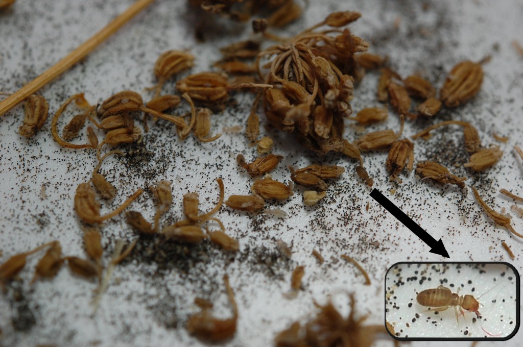 秋まき種子のパセリを蒔こうとしたところ、パセリの種子袋から種子以外の黒い粒がパラパラ出てきました。それだけではなく、褐色の小さな生き物がごそごそ動いています。