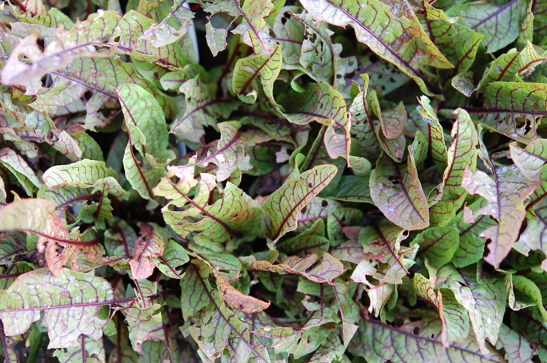 新しく売り出される園芸品種には、詳細な栽培試験を経ず市場に出るものもあるようで、ルメックスの仲間の害虫については詳しく述べられた資料も乏しいようです。当社でも、試験的に導入し、育苗圃で管理しましたが、あっという間に害虫に食べられぼろぼろになってしまいました。この虫は何?と持ってこられた虫は腹脚の数が多く、ぐるぐる丸まっておりハバチの幼虫の特徴を示していました。調べてみると、ハグロハバチの幼虫で雑草のギシギシでよく発生する普通種という事がわかりました。雑草のギシギシやスイバで大発生しても、全く問題にされないため害虫の名前自体もあまり知られていませんが、ギシギシなどと同じタデ科の蕎麦(そば)では害虫として認識されているそうです。成虫は体長7~8mmの黒い蜂で、葉の中に卵を産みつけ、越冬は土中で蛹の状態で行います。