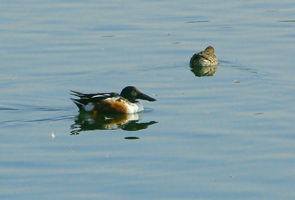 たくさんのカモたちの中で頭が緑色に輝き目立つ大きな嘴をしたカモで、ハシビロガモと言います。これは嘴(クチバシ=ハシ)の幅が広くショベルのような形をしていることから名づけられたものです。英語名はshovelerと言い、やはり嘴の形からきています。