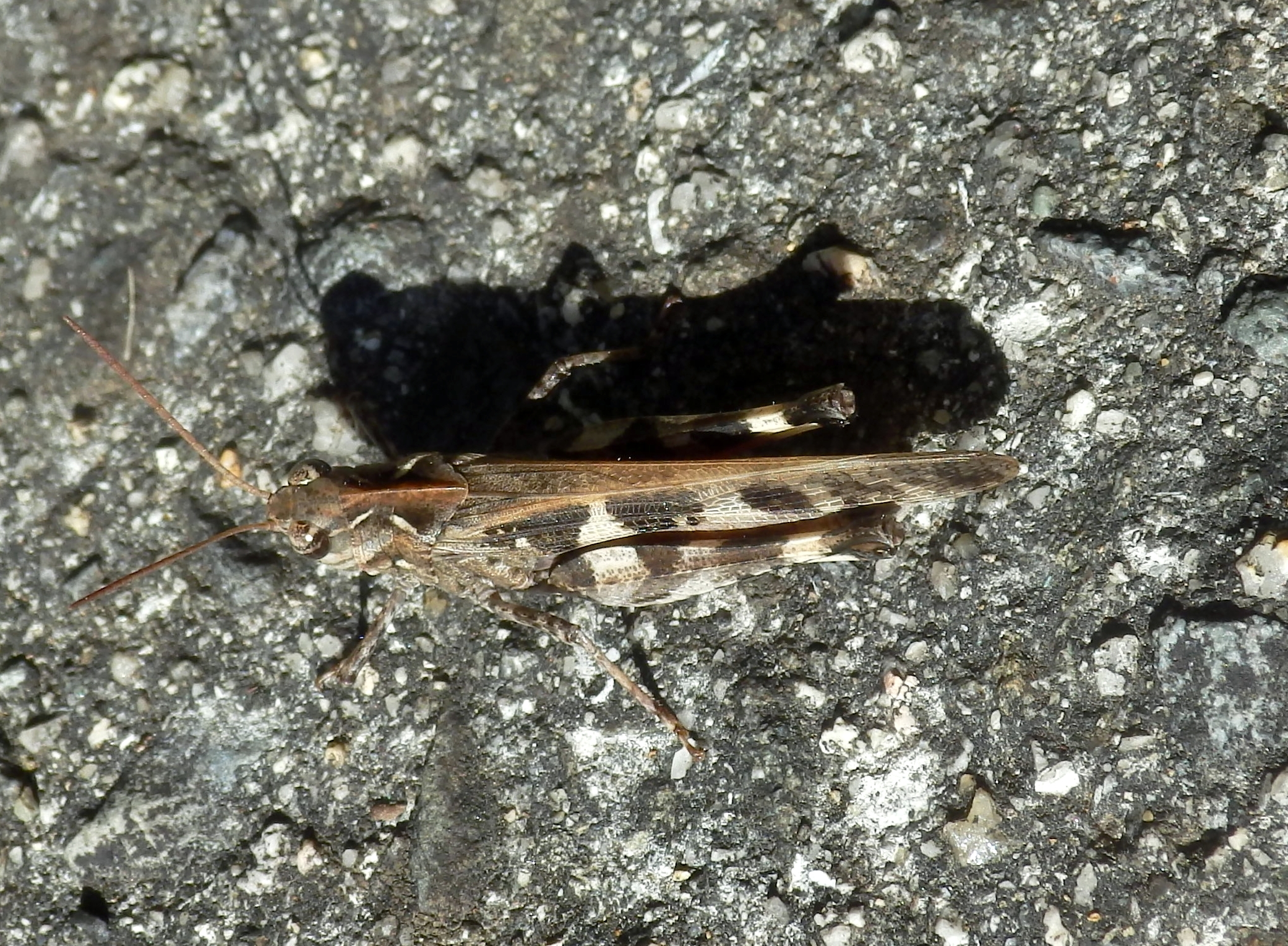 街中の公園でも見られるバッタがいます。バッタ目バッタ科のクルマバッタモドキです。名前のように、クルマバッタに似ているバッタですが体長32~65mmでクルマバッタと比べてやや小型になります。また、草地よりもまばらに草の生えた公園のようなところを好むようです。バッタを上から見下ろすと、胸の背面に白い「く」の字の紋が左右にみられ、「x」字形に見えるのが特徴です。全体褐色のバッタですが、緑色のものもいるようです。