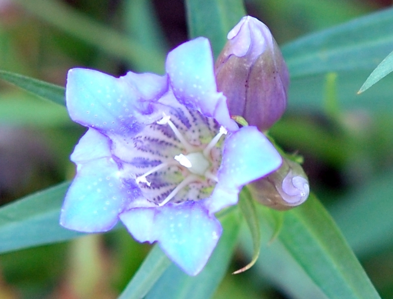 かつて里山と呼ばれる草地が各地で見られたころ、秋になればやや湿った草地のあちらこちらで釣り鐘型の青紫色の花がみられました。リンドウ科、リンドウ属のリンドウの花で、草丈20cm~100cm、直立あるいは斜上した茎の先端または上部葉腋に太い蕾を付けます。花は晴天時のみに開き、1週間程度咲き続けます。葉は笹の葉に似た卵状披針形で3脈が目立ち対生します。葉の形から、他のリンドウ類と区別するためササリンドウと呼ばれることもあります。日本では、本州、四国、九州に分布し、草刈りをされることで生存が維持されてきましたが、草刈りが中止されると、他の草の成長に押され消滅してしまいます。