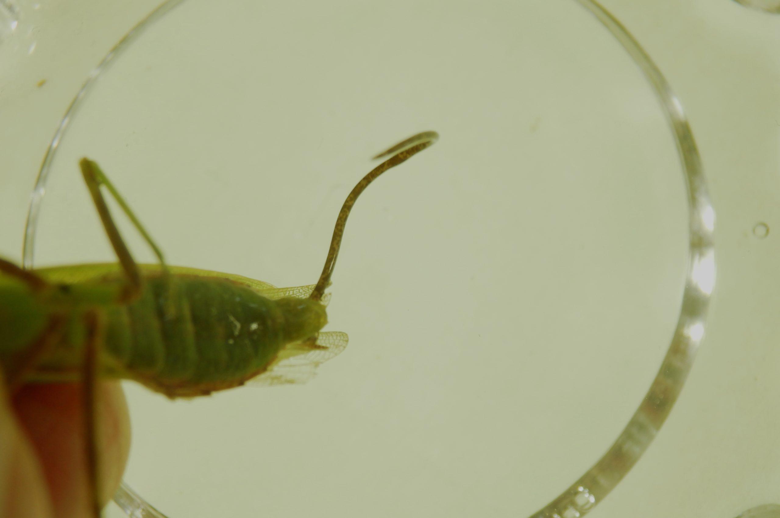 これらのハラビロカマキリのお尻を、水に漬けてみると、数秒後にハラビロカマキリのお尻から、細長い針金のようなものがスルスルと伸びてきます。この針金のようなものは、カマキリなどに寄生するハリガネムシと呼ばれるハリガネムシ目の寄生虫でハリガネムシと呼ばれます。ハリガネムシは、世界中で300種以上が確認され、実際には 2000種ぐらいいるのではないかともいわれています。ハリガネムシは水生動物で、秋に水中で交尾産卵し、孵化した幼体は水中の水生昆虫などに寄生しシスト(休眠体)となって休眠越冬し、春になって寄生した水生昆虫が羽化し陸上でカマキリなどに捕食され陸上での寄生生活を続けます。秋口にハリガネムシが成体になると、宿主(カマキリ、カマドウマ、ゴミムシなど)の行動をコントロールし水辺へ移動させ、水中へ投身させます。この時宿主は魚の餌食になりますが、その前の数秒の間に宿主から脱出し水中生活に移ります。樹上生活昆虫であるハラビロカマキリを、水辺へ誘うのは水面で反射する一部の光線で、同じ光線がアスファルトからも出るためアスファルト道路でもハラビロカマキリがみられるようになります。