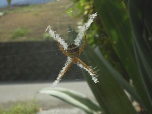 本州(岩手南部以南)、四国、九州、南西諸島の平地、山地、民家周辺に普通にみられるようです。頭を下に向けているのは、獲物がかかった時飛びかかり易いともいわれますが、網の上のほうに獲物がかかった場合はどうでしょうか。身の身を守るため逃げる際には下向きが有利かもしれませんね。Ⅹ字型の白帯の意味もよくわかりません。「餌を誘うため」、「鳥が衝突し網がつぶされないように」、「網を安定させるため」などと言われているようです。