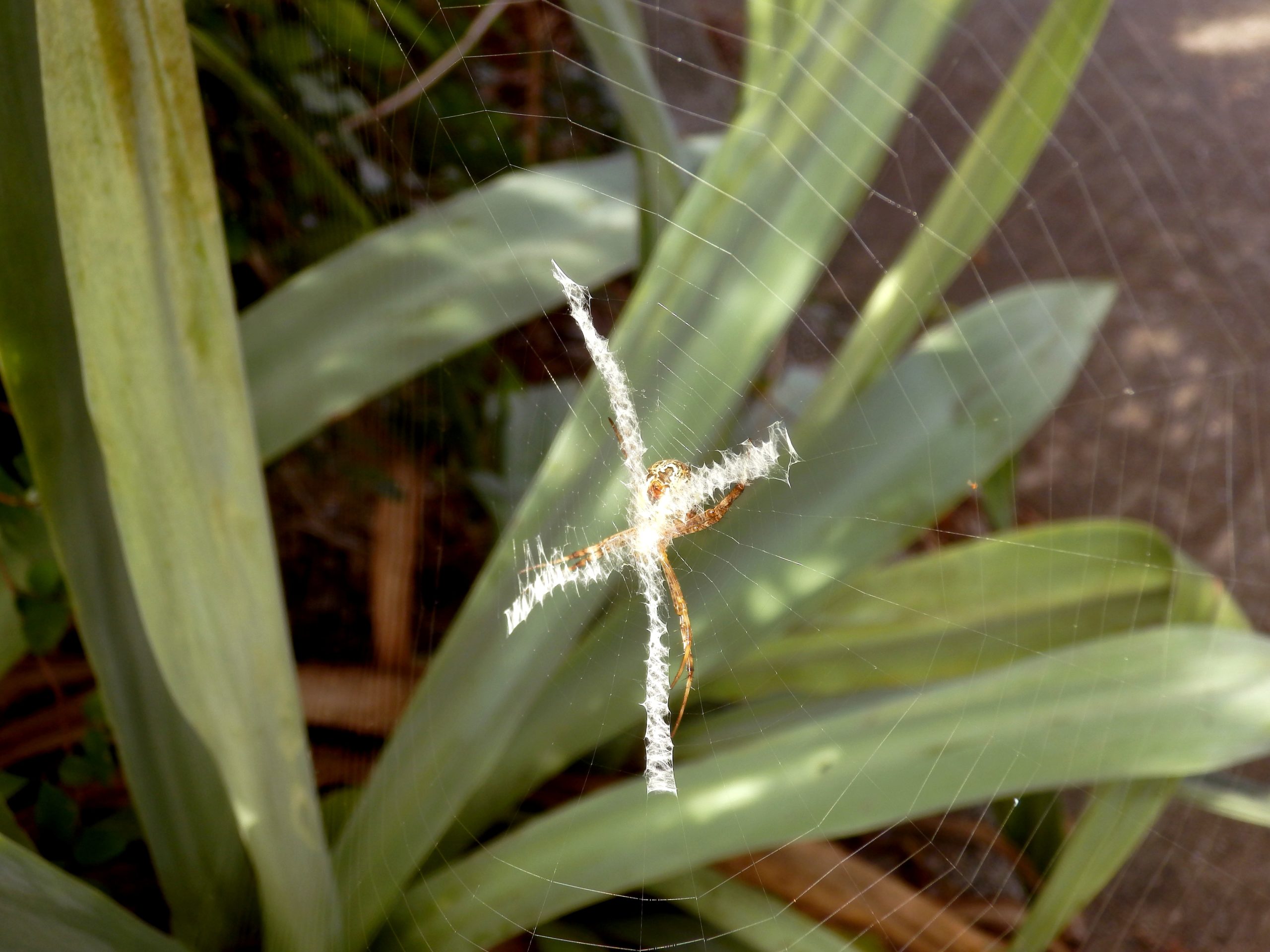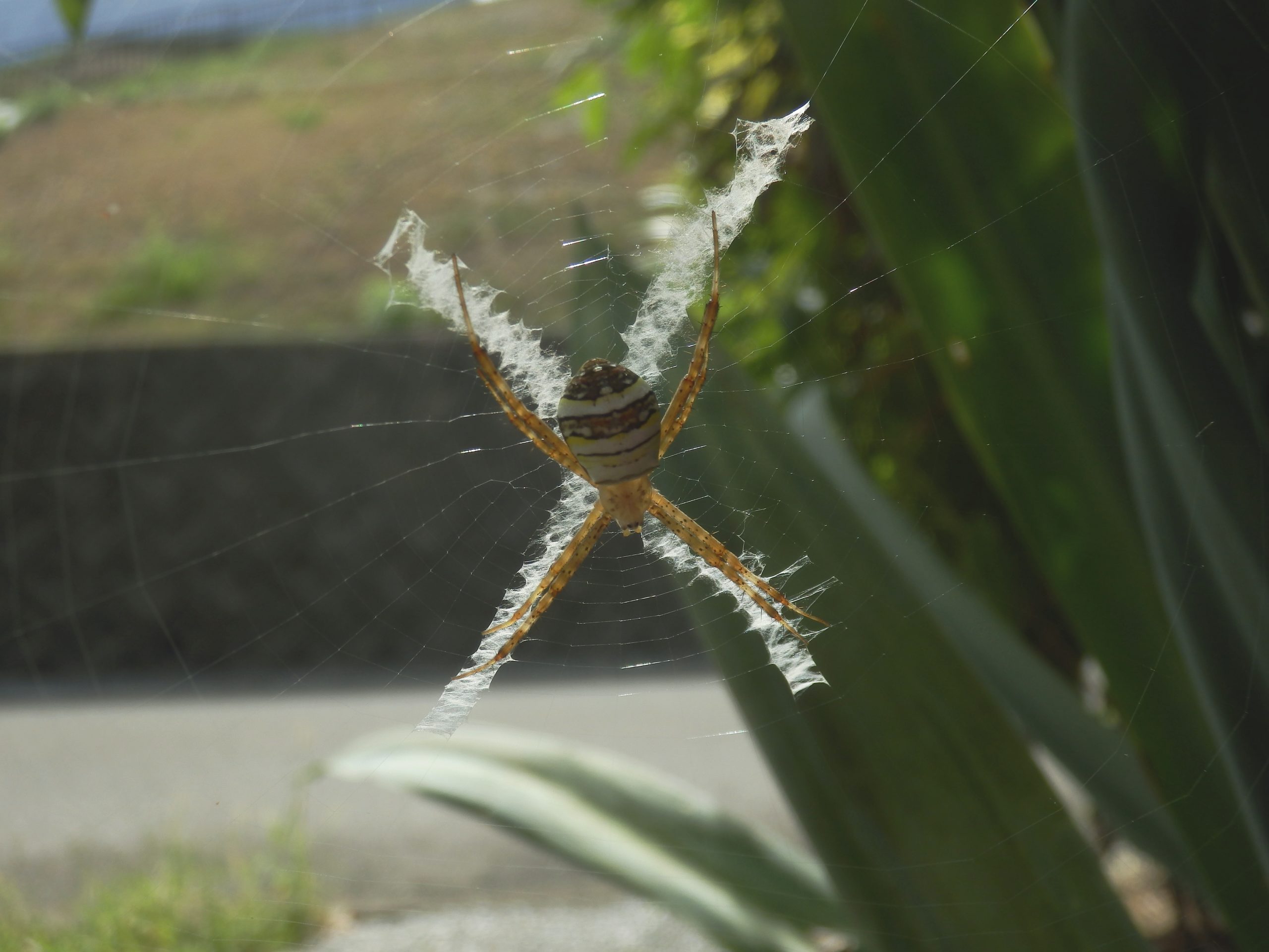 生垣に円形のクモの巣があり中央にⅩ字型の白い帯を見つけました。この白い帯に合わせるようにコガネグモの仲間が脚を2本ずつ合わせ、頭を下にして獲物がかかるのを待っていました。このクモは、腹部が黒褐色で黄白帯が3本、黒色部には白点があります。脚は褐色で黒い環状の斑紋がみられます。体長は10㎜程度です。これらの特徴からコガネグモ科のコガタコガネグモと思いますが、非常によく似たクモでムシバミコガネグモ(体長15~18mm)というのがいるようで、正確には雌の外雌器を観察して区別するようですが、体長からコガタコガネグモとしました。